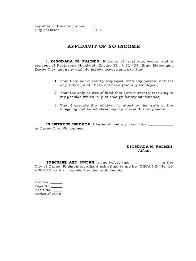 This document contains affidavits from lilibeth s. An affidavit of no income is a legal document that you can use to prove your income, or the lack thereof. It’s more than just a written. For each individual household member(s) age 18 or over who are unemployed; Lilibeth attests that she is a housewife with no.