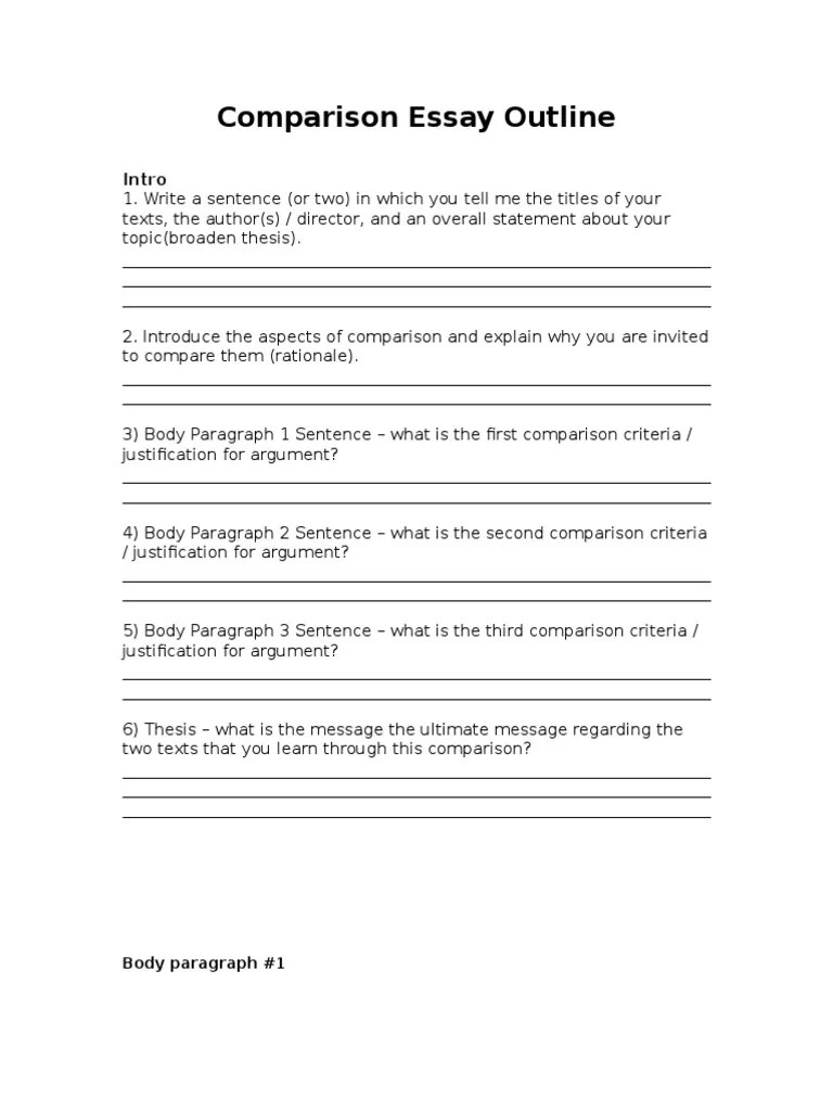 Thesis statement with the list of characteristics Writing a comparison essay can be challenging, but with the right approach and guidance, you can craft a compelling and informative piece of writing. Find out when to use this skill, how to structure your comparisons, and see. Feel free to use the template by studycrumb to make your own outline on the.