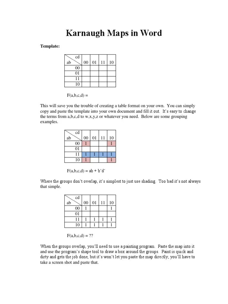 Karnaugh map abbreviates to k. Mit opencourseware provides a worked example on karnaugh maps, accessible to everyone. Draw the karnaugh map that represents the expression by placing a mark in each appropriate square. A karnaugh map is nothing more than a special form of truth table, useful for reducing logic functions into minimal boolean expressions. A karnaugh map is a.