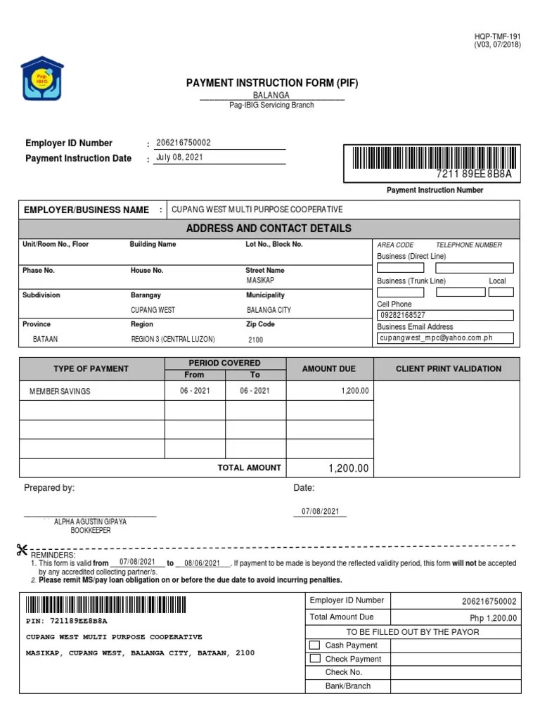 Payment Instruction Form (Pif) Balanga PDF Payments Financial