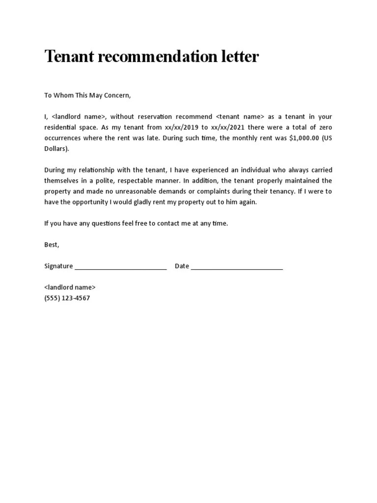 Luckily, tenant recommendation letters are generally concise letters that do not require a lengthy time to produce. The landlord recommendation letter is designed for a former tenant seeking a letter of confidence to present to a new landlord. Landlord recommendation letter for a tenant. Learn how to write a letter of recommendation for a tenant with sample landlord reference letters.